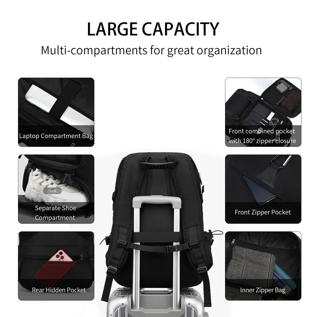 • LARGE CAPACITY AND ORGANIZED: The backpack has 3 spacious main compartments can accommodate lots of stuffs like college supplies, travel accessories, clothes, notebook, equipped with shoes warehouse, side Elastic net pockets conveniently hold umbrellas or water bottles.