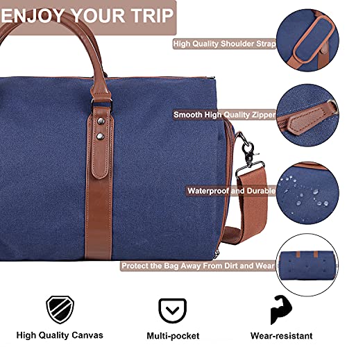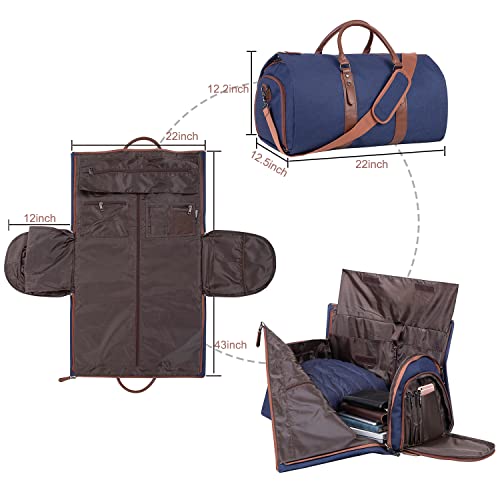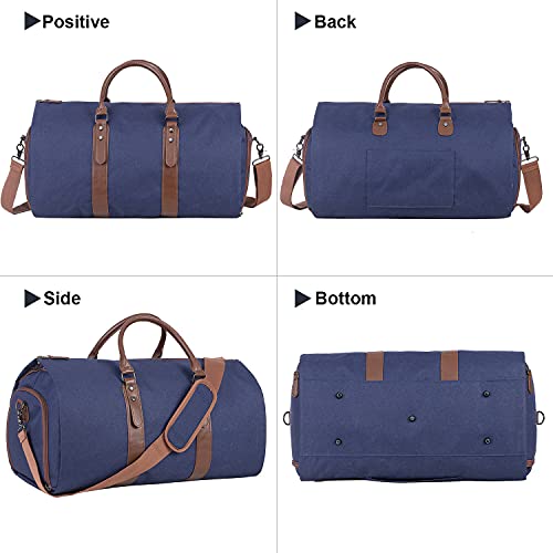 Details: 2 in 1 Garment Duffel Bag More fashion, More convenience Durable material and craft, it’s not loosing stitching, cuts and tears in the leather, uneven seams and the like, this is a well-made bag that has been assembled with some care. And this bag will be good for your daily use, it’s lightweight and sturdy. It has the option for a shoulder strap and a handle. Product Information: Color: Blue Material: Canvas Size:(L)22'' x (W)12.5'' x (H)12.2'' Style: handbag, shoulder bag, messenger bag Advantage Exclusive Shoes Compartment The men's weekender bag has an exclusive shoe compartment from the side zipper pocket, the better to separate the shoes from your personal hygiene belongings. Great Hanging Garment Bag for Travel While open this Garment Bag and lay it out, it is a great hanging garment bags for travel. With this Hanging Garment Bag, you can have a wrinkle-free suit or dress at any given time. No Wrinkles Trouble Your Dress or Suits Any More. Adjustable Shoulder Strap It is convenient for you to adjust the length of the shoulder strap anytime and anywhere according to your needs