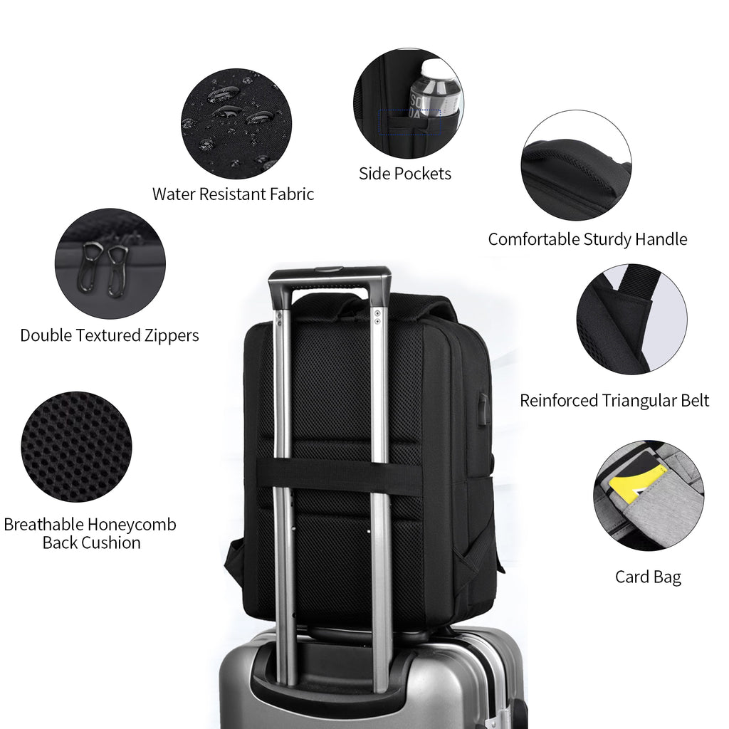 -【Ergonomic & Thoughtful Design】The laptop backpack features a breathable honeycomb mesh back panel for excellent pressure relief, shock absorption, and heat dissipation. The detachable trolley sleeve on the back, card slots on the shoulder straps, and a USB charging port on the side enhance convenience.