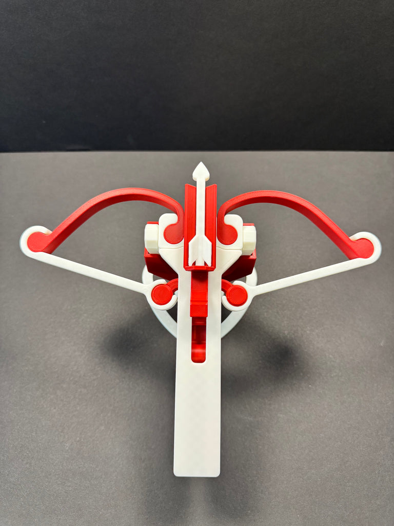 Cupid's Crossbow is a fully functional 3D-printed catapult designed for entertainment, display, and easy launching. Mounted on a sturdy stand, it fires standard Nerf darts as well as decorative heart-shaped arrows, making it perfect for Valentine's Day displays, gifts, or fun desktop decorations.